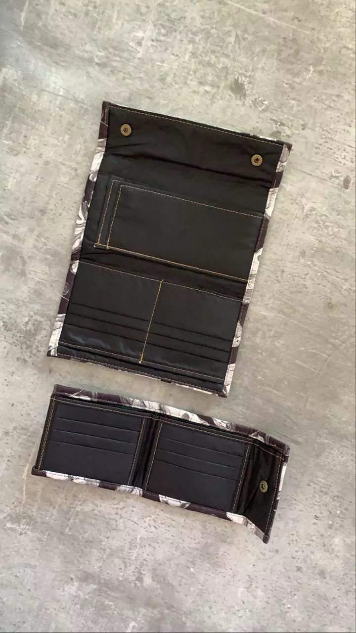 Hecha de sarga engomada con ilustraciones exclusivas de la marca. Interior de silver impermeable. Cuenta con un compartimiento para el dinero, dos bolsillos, divisiones para 6 tarjetas. Cierra con dos broches a presión.