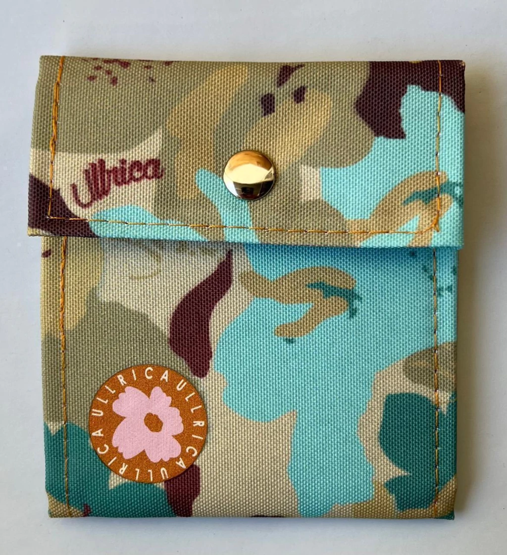 Hecha de sarga engomada con ilustraciones exclusivas de la marca. Interior de silver impermeable. Cuenta con un compartimiento para el dinero, dos bolsillos, divisiones para 6 tarjetas. Cierra con un broche a presión.