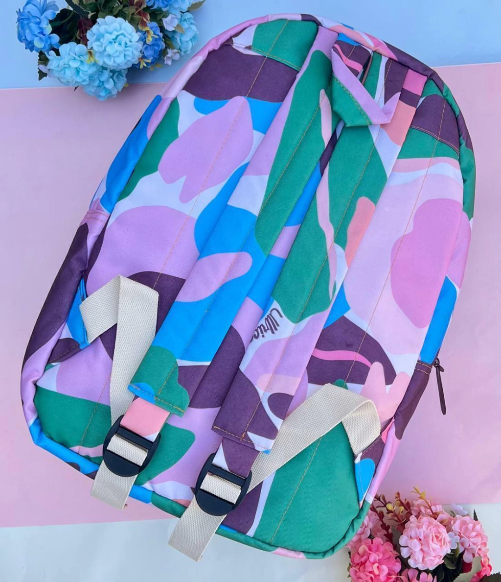 Hecha a partir de ilustraciones propias. Exterior de cordura engomada impermeable. Cuenta con un bolsillo exterior con cierre en el frente. Manijas reforzadas y regulables. Posee separación acolchonada portanotebook