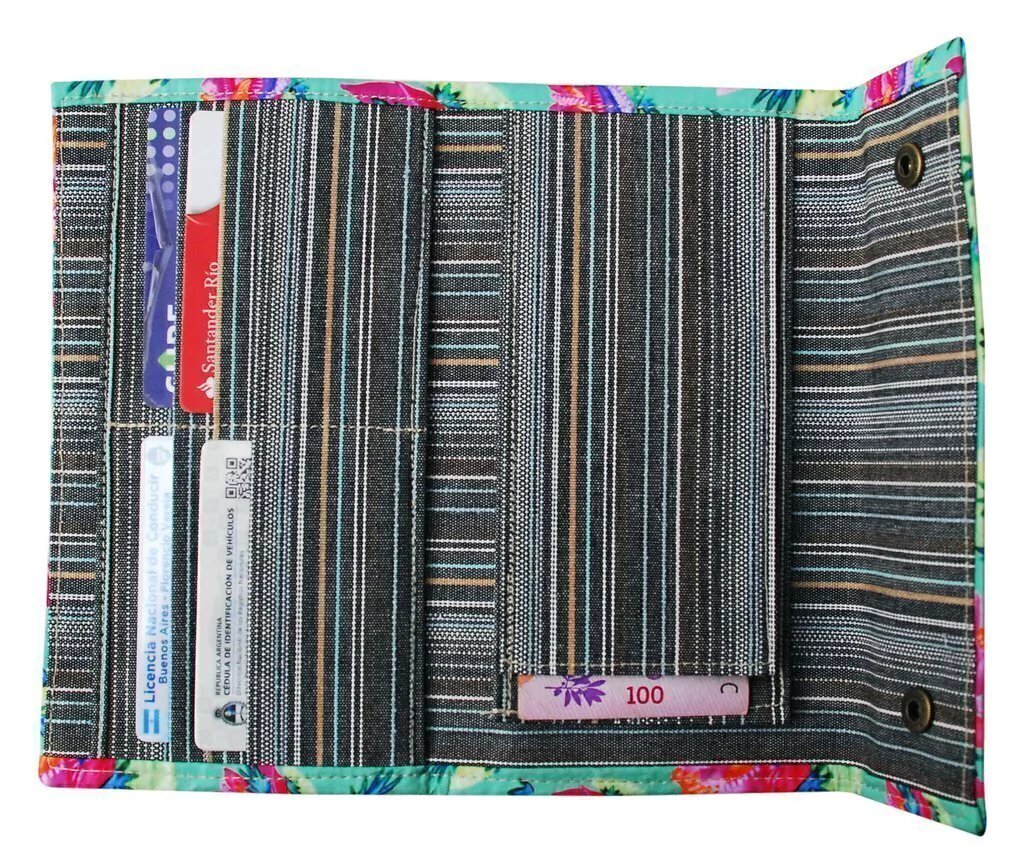 Hecha de sarga engomada con ilustraciones exclusivas de la marca. Interior de silver impermeable. Cuenta con un compartimiento para el dinero, dos bolsillos, divisiones para 6 tarjetas. Cierra con dos broches a presión.
